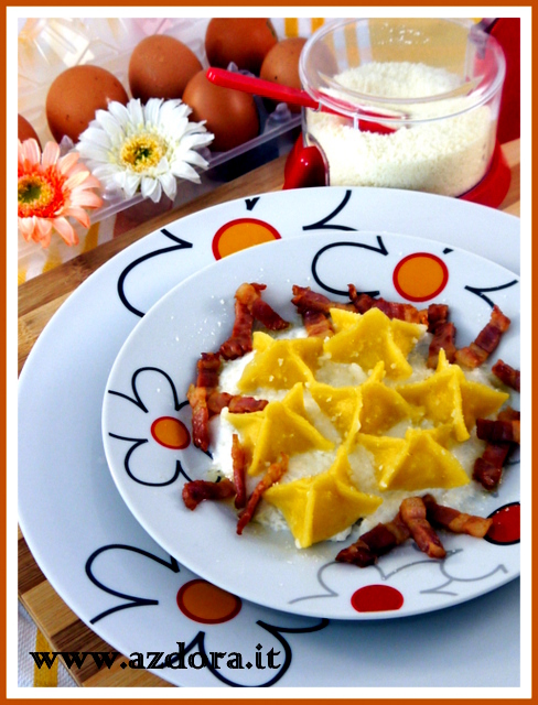 Необыкновенно вкусные равиоли забавной формы с яично-сырной начинкой. Для любителей пасты «Карбонара». Вкус очень близок к ней, но подача очень оригинальная.