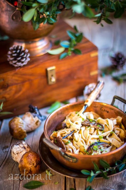 Можно приготовить тальятелле с сушеными грибами. В этом случае, замочить щедрую горсть сухих белых грибов в воде минимум на ночь ( а не как написано на упаковке, на пару часов). Я замачиваю часов на 15. Замоченные грибы достать из воды и порезать на кусочки желаемой величины. Воду от грибов процедить.