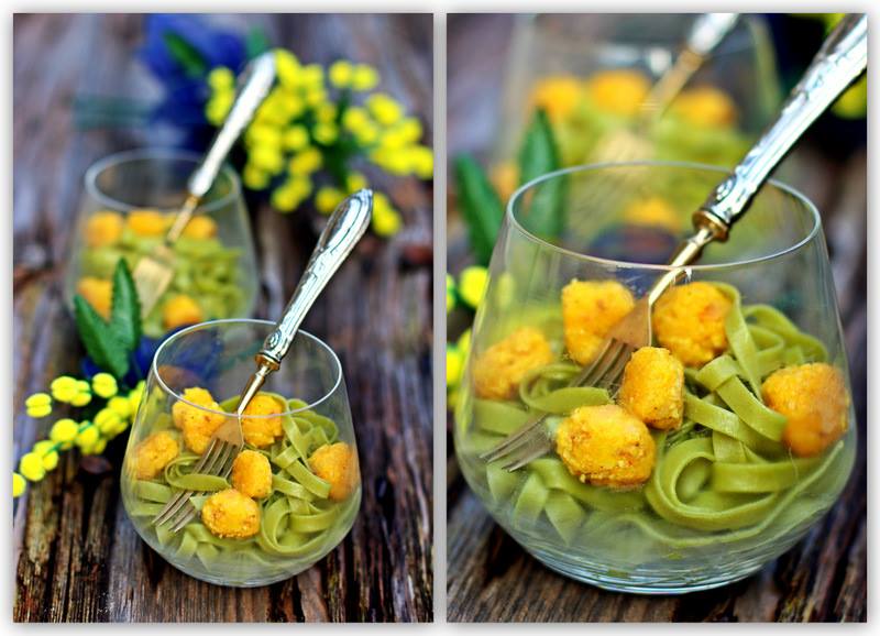 Tagliatelle "Mimosa". Зеленые тальятелле с рыбными шариками