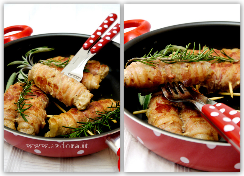 Ломтики свинины отбить. Посолить и поместить на край каждого ломтика листик (если листики маленькие, то два) шалфея и панчетту, порезанную на полоски.