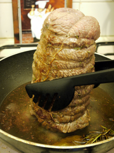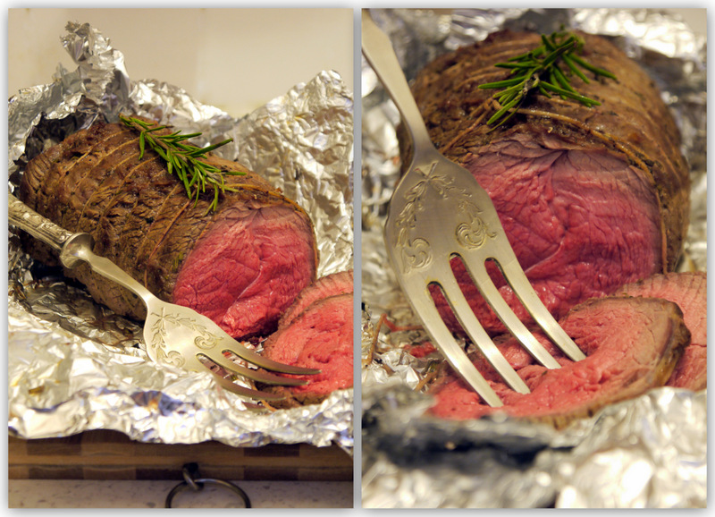 Теперь ростбиф можно тонко порезать. Режьте так, чтобы сок, который выделится при резке, можно было собрать. Уварите этот сок и подайте вместе с мясом.