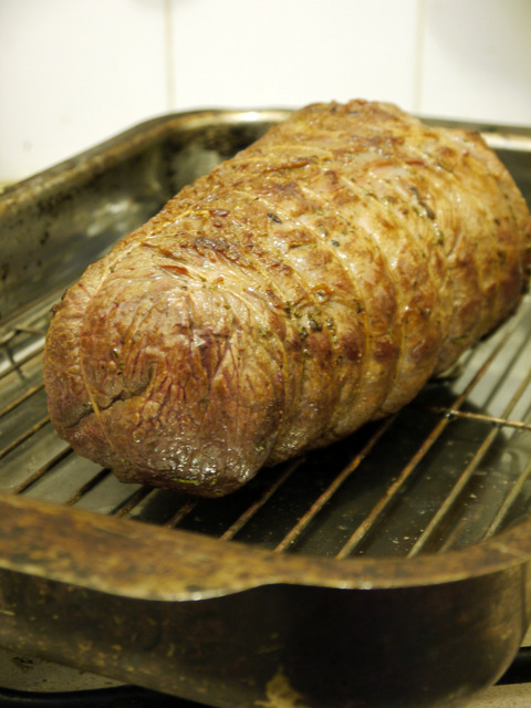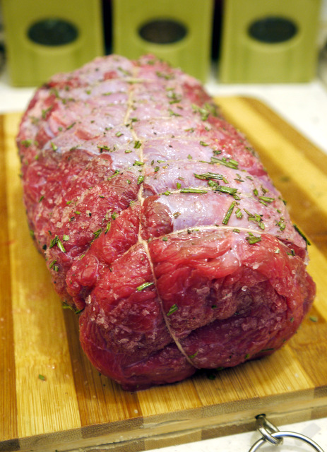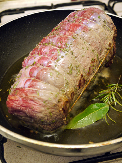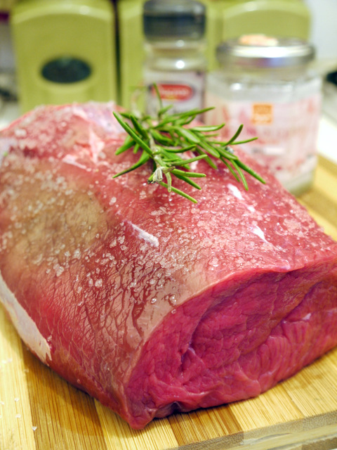 Пока духовка греется, подготовьте мясо: смажьте кусок мяса оливковым маслом и натрите смесью соли, перца и мелко порубленного розмарина.
