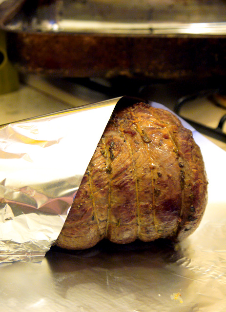 Готовое мясо достать из духовки и завернуть в фольгу на несколько минут.