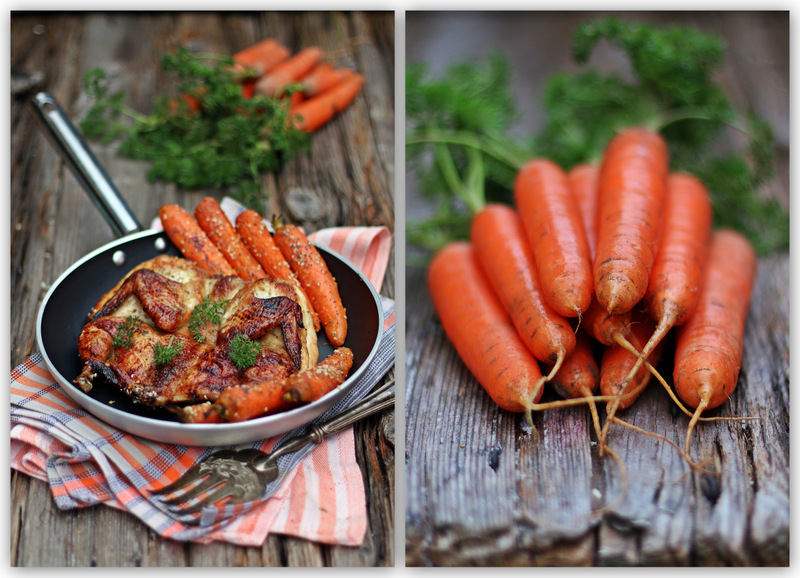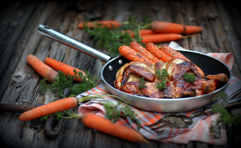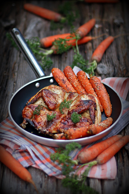 Курицу можно так же запечь в духовке. На гарнир очень подходит запечённая молодая морковь. Для этого смешайте сок половинки лимона с несколькими ложками оливкового масла, выдавите дольку чеснока, добавьте щепотку соли и перца и немного тимьяна. Перемешайте и обмажьте полученным соусом свежую мытую морковь. Присыпьте морковь семенами кунжута и мака. Запекайте вместе с курицей ровно 1 час.