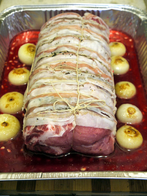 Свиную вырезку посолите и поперчите. Заверните вырезку в тонко порезанные ломтики грудинки. С помощью шпагата обвяжите вырезку с грудинкой, чтобы она не потеряла форму во время тепловой обработки.