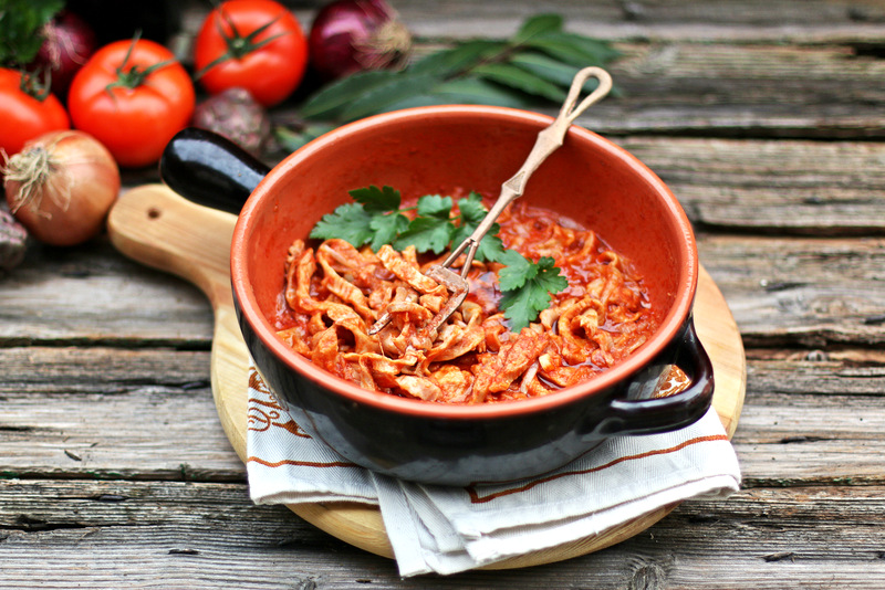Влейте томатный соус и немного воды. Посолите, поперчите по вкусу и потушите на медленном огне под крышкой около часа. Чтобы соус загустел, последние 15 минут снимите крышку.
