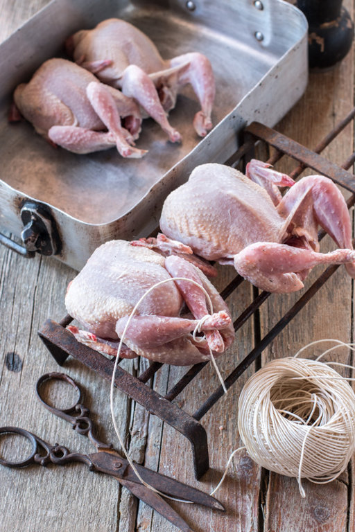 Перепёлок опалить, чтобы удалить оставшиеся пёрышки. Связать кухонным шпагатом лапки у перепёлок, чтобы они держали форму.