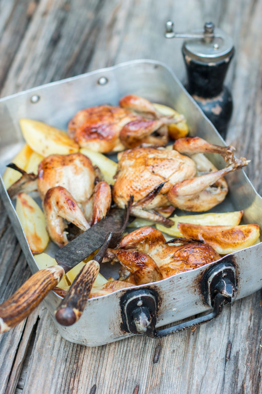 Перенести картофель в смазанную форму, поместить в неё перепёлок, полить оливковым маслом. Накрыть лапки перепёлок фольгой, чтобы они не сгорели.