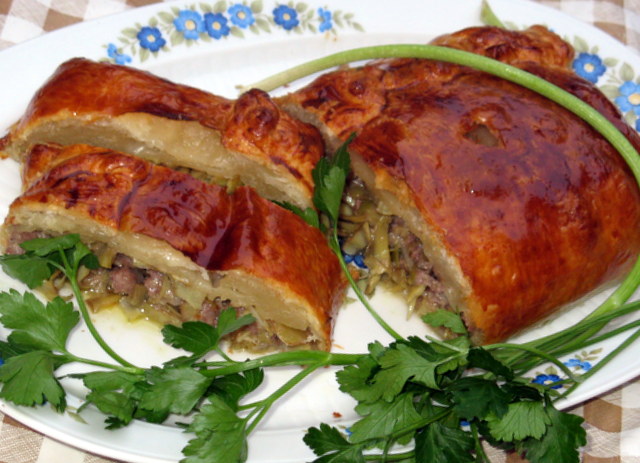 На готовое слоёное тесто разложить начику из артишоков с сальсиччей.