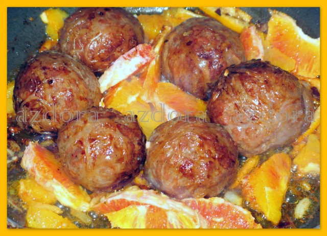 Обжарить на этом масле тефтельки. Как только они начнут румяниться, добавить щепотку острого перчика чили и влить уксус, который быстро выпарится, и апельсиновые дольки. Подержать тефтельки в соусе ещё 1 минуту. Тефтельки готовы.