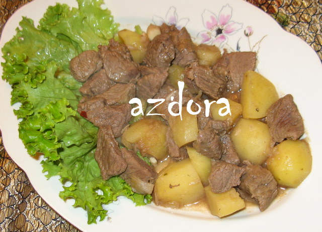 Мясо нарезать крупными кусочками. Добавить мясо к слегка поджаренному луку.