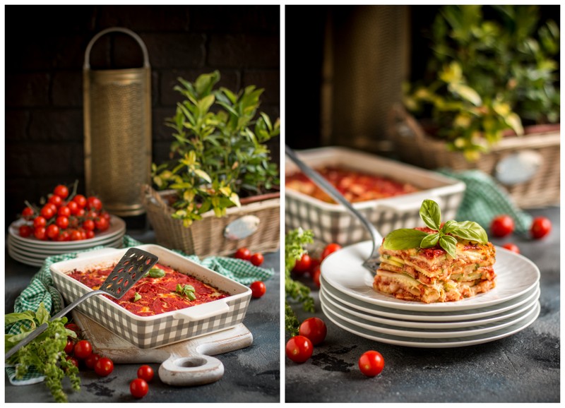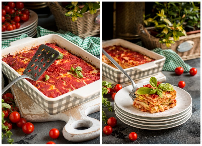 Смазать форму для выпечки тонким слоем томатного соуса, присыпать хлебными крошками. Сделать слой цукини, присолить их и на них сделать слой из сыра. Присыпать пармиджано и повторить все слои сначала. Закончить слоем томатного соуса.