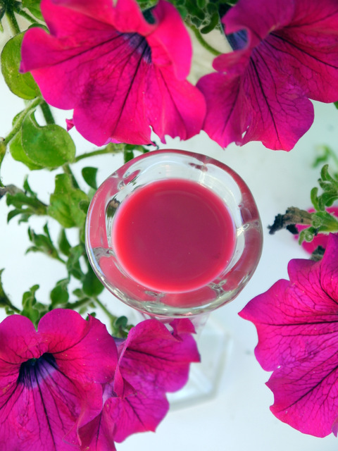 Налейте морковный и яблочный сок в блендер, добавьте кубики льда, свёклу, имбирь и сок лимона.