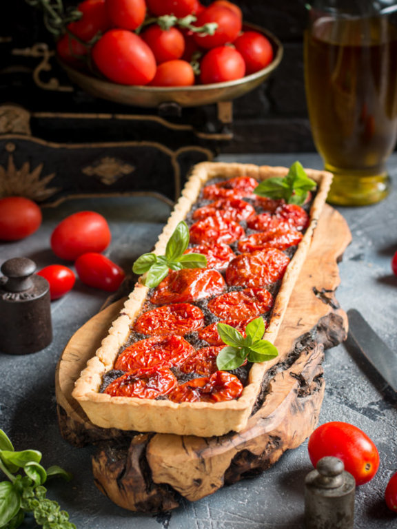 Crostata di pomodori, olive e acciughe