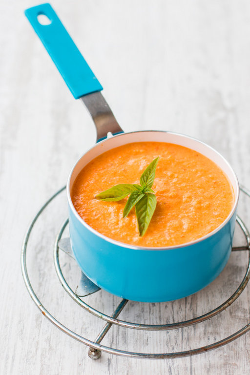 Влейте апельсиновый сок, перемешайте и пюрируйте погружным блендером.