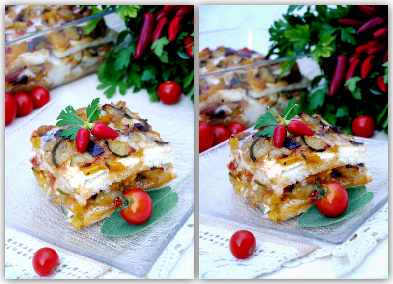 Начинайте укладывать в форму смазанные сыром ломтики хлеба. На них выкладывайте слой овощного рагу, сверху на рагу немного тёртого сыра, который хорошо плавится.