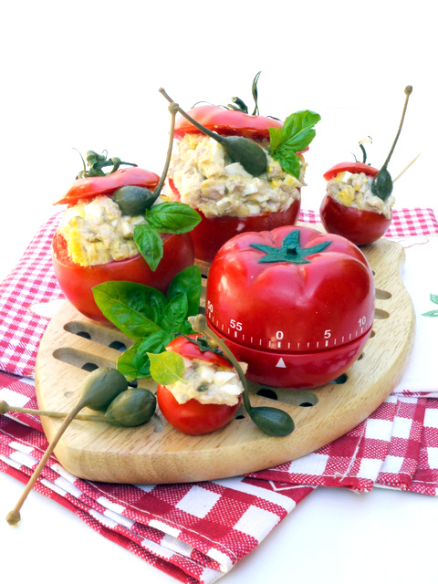 Смешайте вместе все ингредиенты, наполните полученным салатом помидоры.