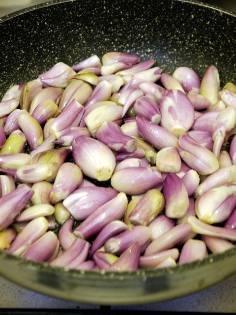 Почистите лук шалот, удалите внешние шкурки, пока не дойдёте до центральной части фиолетового цвета. Обжарьте очищенный лук с одной ложкой оливкового масла на слабом огне, слегка его подрумянив.