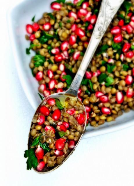 В миске смешайте готовую чечевицу и зёрнышки граната.