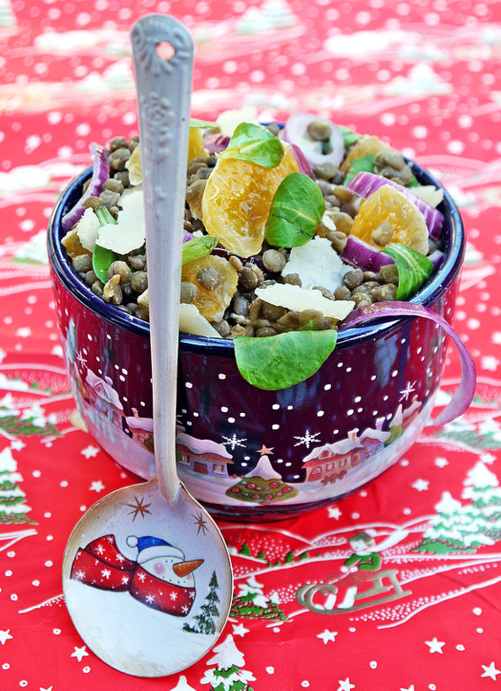 Поместите зелёный салат и апельсины в миску, добавьте лук, чечевицу и сыр, порезанный хлопьями.