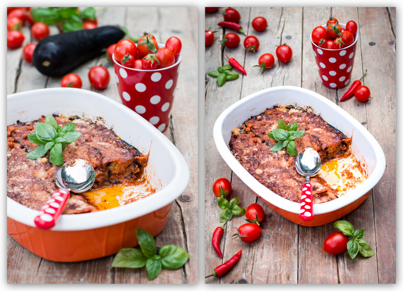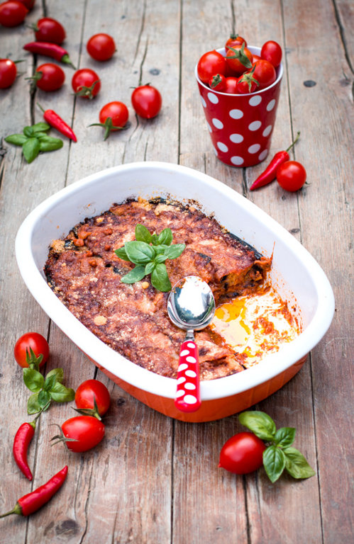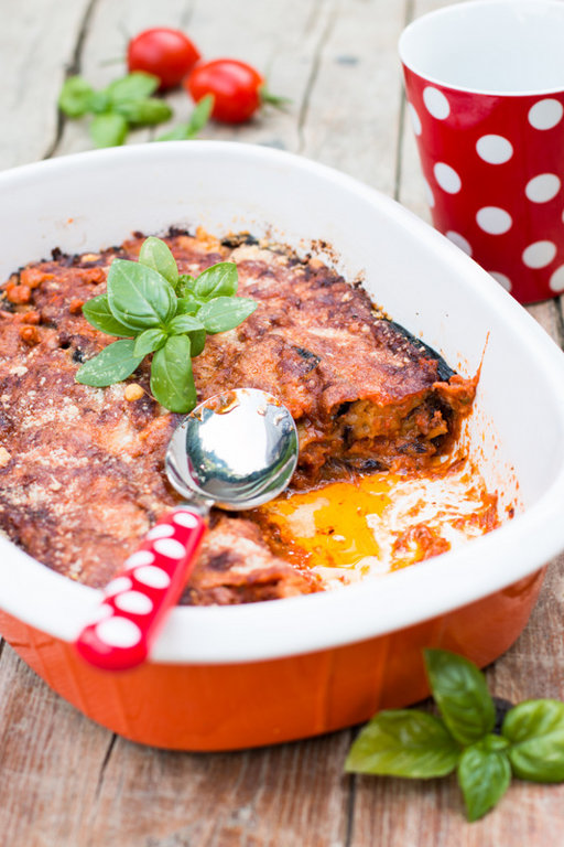 Продолжить в таком порядке, пока не кончатся все ингредиенты. Закончить слоем баклажан и томатным соусом без яиц.