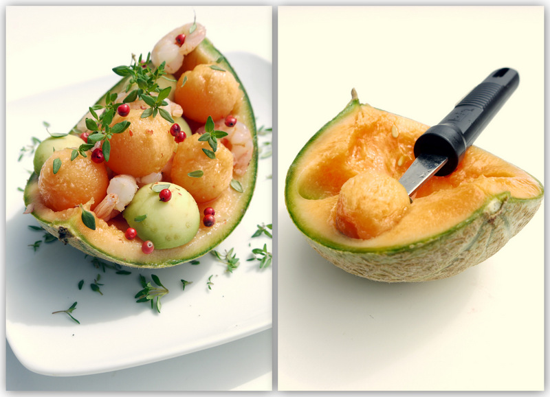 Из мякоти дыни специальной круглой ложечкой вырежьте шарики. Удалите лишнюю мякоть, чтобы получились лодочки. Поместите шарики из дыни в миску с креветками, посолите и перемешайте.