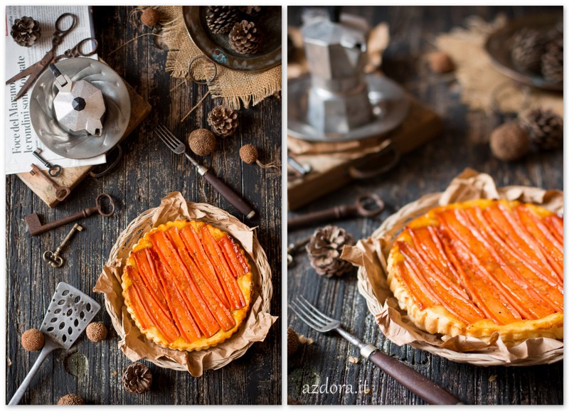 Морковку почистить, разрезать пополам. На оливковом масле обжарить 3 зубчика чеснока со свежим тимьяном. Добавить 40 гр сахара и сок одного апельсина. В полученный сироп поместить морковь и потушить под крышкой минут 15-20 на слабом огне, пока морковь не станет мягкой. Снять крышку и дать моркови карамелизироваться слегка. Перенести в форму для запекания, накрыть тестом бризе и выпекать 25-30 минут при 180°.