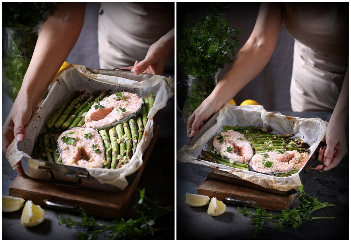 Salmone con gli asparagi al forno