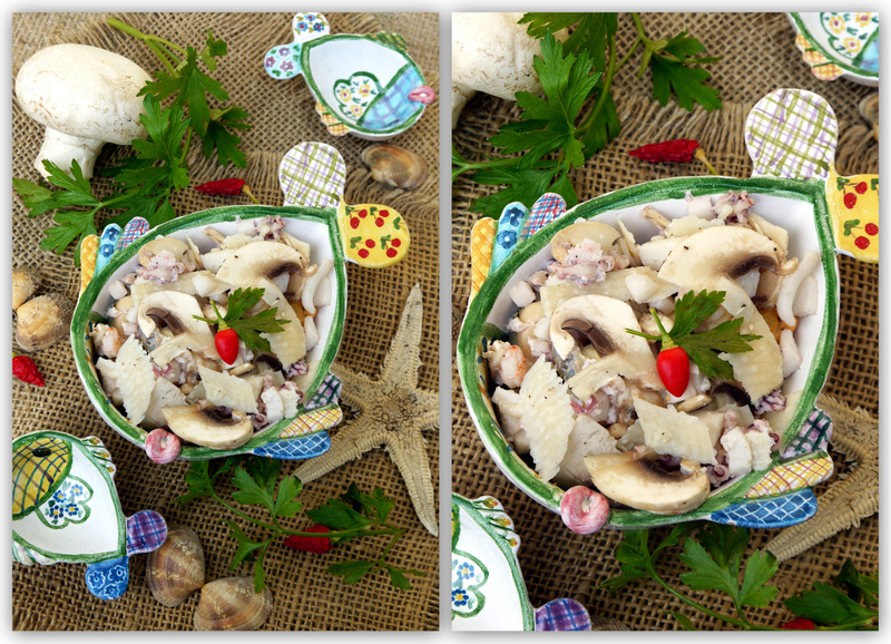 В миске смешать морепродукты с шапминьонами и сыром, заправить соусом и подать.