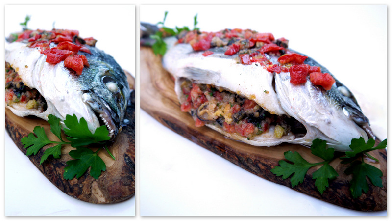 Поместите рыбу в форму для запекания, полейте оливковым маслом, накройте форму фольгой и запекайте в духовке, разогретой до 180° около 50 минут.