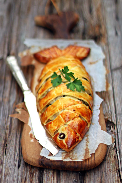 Смажьте взбитым яйцом и запекайте при 180° минут 30 или пока рыбка не подрумянится.