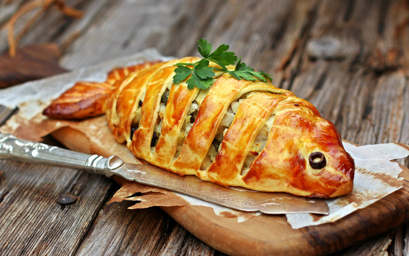 Надрежьте тесто по кругу лучами на полоски шириной в 2 см. Переплетите полоски, сформировав голову и, в самом конце, хвост. Из кружка оливки сделайте глаз.