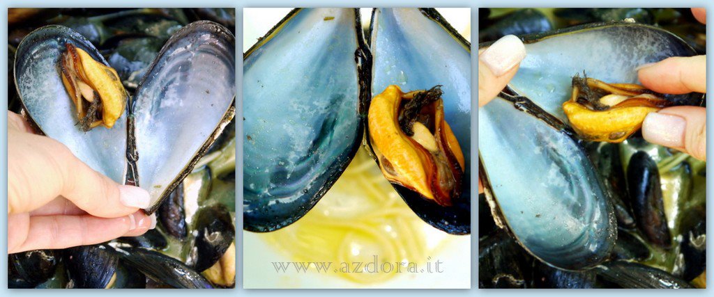 Сегодняшний обед называется "Покоцаем?". По-итальянски, мидии называются cozze - коцце, с ударением на "О". Я их, любя, ещё называю итальянскими семечками. Собирают мидии прямо у наших берегов. Они живут колониями, прикрепившись одна к другой и образуя гроздья, на прибрежных камнях или каменных волнорезах. Но чем дальше они от берега и особенно от общественных пляжей, тем они чище и вкуснее. Готовить их очень просто. Нужно лишь резким движением оторвать кусочек тины, который выглядывает из ракушки и за который они крепятся друг к дружке.Затем в большой, очень большой, сковороде на оливковом масле нужно обжарить чеснок и пеперончино. А я использую уже готовую смесь из этих продуктов, которая содержит так же и сухую петрушку и называется,извините, "путанеска". Опускаю коцце (или мидии, если вам так понятнее) в сковороду и вливаю немного белого сухого вина. Накрываю крышкой и через минут 5, как только все мидии открылись, блюдо готово и можно покоцать от души. Под крышкой должно быть много свободного места, потому что, открывшись, мидии увеличаться вдвое в объёме. Вот почему сковорода должна быть очень большая.
