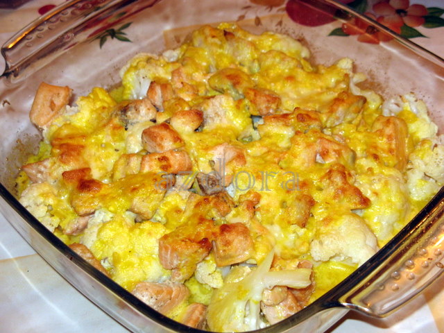 На цветную капусту распределить лосося.Залить соусом.Присыпать сыром. Запекать при 180° около 15 минут, пока капуста не зарумянится.