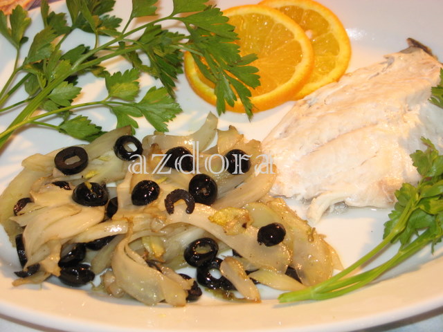 На оливковом масле обжарить фенхель.Посолить,поперчить. Добавить горсть оливок, порезанных пополам.