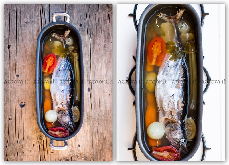 Поставить на огонь кастрюлю с солёной водой, добавить помидоры, лавровый лист, базилик, петрушку, луковицу и морковь, разрезанные на несколько частей, сельдерей, чеснок, гвоздику, перец. Погрузить в кастрюлю рыбу.