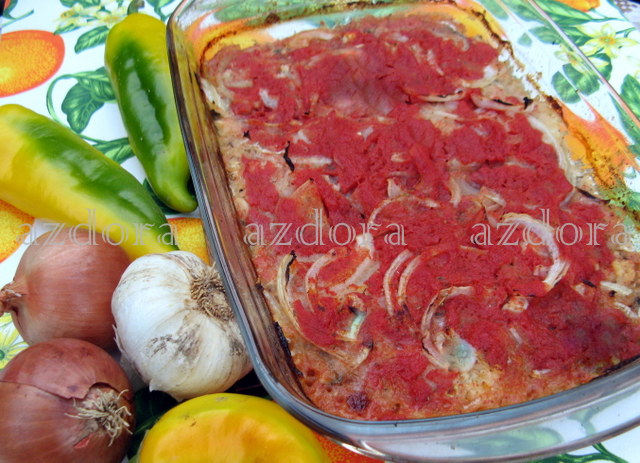 Нарезать луковицу на тонкие полукольца и распределить их по рыбе. Влить немного вина и добавить томатный соус. Сбрызнуть сверху оливковым маслом и запекать в разогретой до 220° духовке около 20-25 минут (до готовности лука). Подавать на стол, не вынимая из формы.