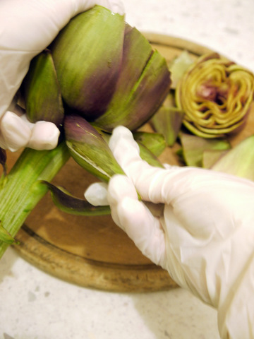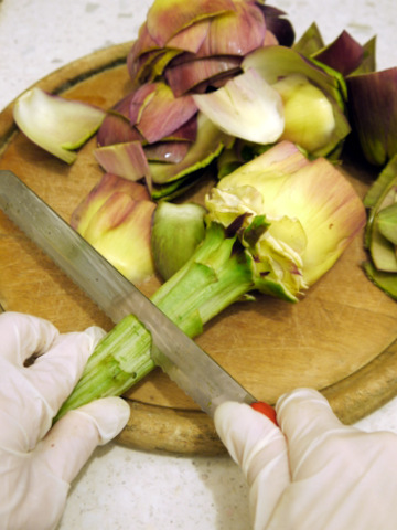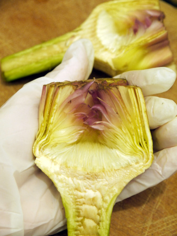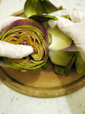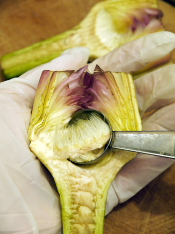 Если же вы хотите фаршировать артишоки и не можете разрезать их пополам, всего лишь раздвиньте листья бутона и выскоблите эту неприятную серединку. Вам это только на руку - будет больше места для фарша.