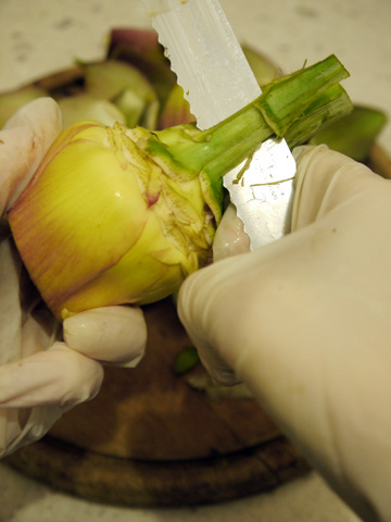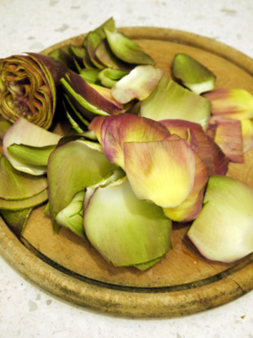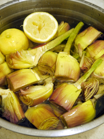 Очищенный цветок опустите с миску с лимонной водой. Очищенные таким образом артишоки могут храниться в миске с водой в холодильнике несколько дней.