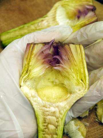 Четвёртый шаг: нужно удалить центральную часть бутона. Она непритяна на вкус и по-итальянски называется "сено". Вот посмотрите на неё поближе.