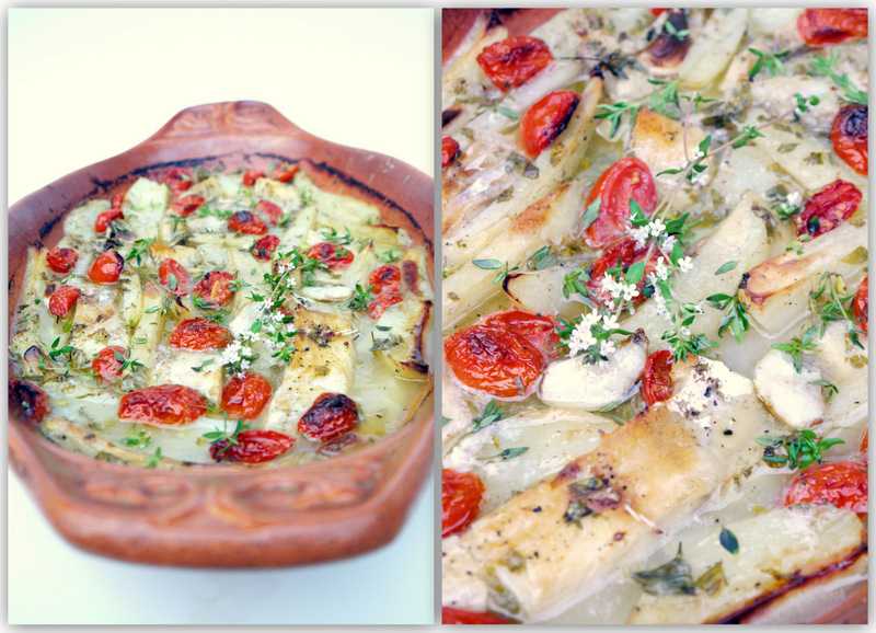 Оросить блюдо сверху оливковым маслом и запекать в разогретой до 180° духовке до готовлности картофеля (около часа).