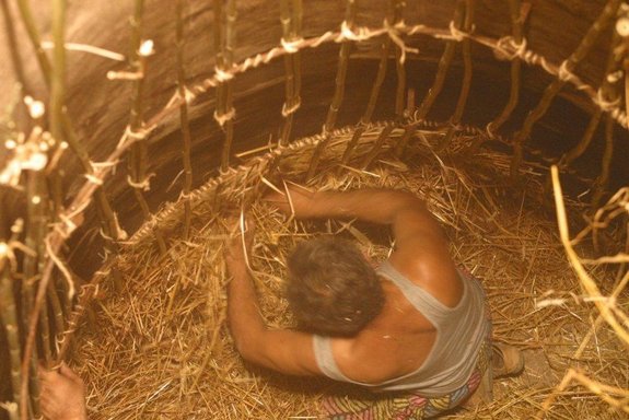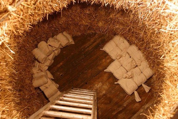 Затем он переходит к изоляции стен колодца. Для этого стены покрываются слоем соломы в 15 см, которые закрепляются вертикальными жёрдочками из тростника и горизонтальными деревянными кольцами. На дно кладут деревянный настил.