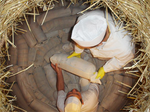 А настоящее искусство требует руки мастера. И такой мастер появляется за несколько дней до закладки сыра на хранение и начинает работать над подготовкой колодца. Несколько дней он жгёт солому. Это нужно, чтобы просушить колодец и простерилизовать его, убив всех возможных микробов, которые могут негативно повлиять на процесс ферментации сыра.
