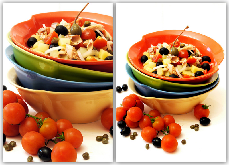 Смешать картофель, тонко порезанный лук, помидорчики, маслины и каперсы.