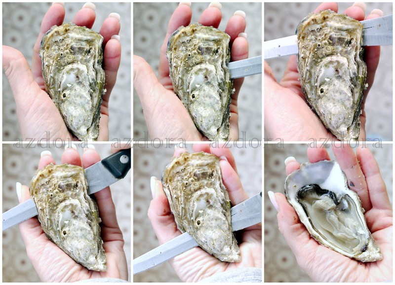 Устрицу нужно положить на левую лодонь острым концом к себе. Выпуклая  часть её ракушки удобно помещается в ложбинке ладони. Дело в том, что, чтобы окрыть устрицу, нужно надрезать её мышцу. В  том положении, в котором устрица сейчас лежит у вас на ладони, мышца находится по середине правого края.