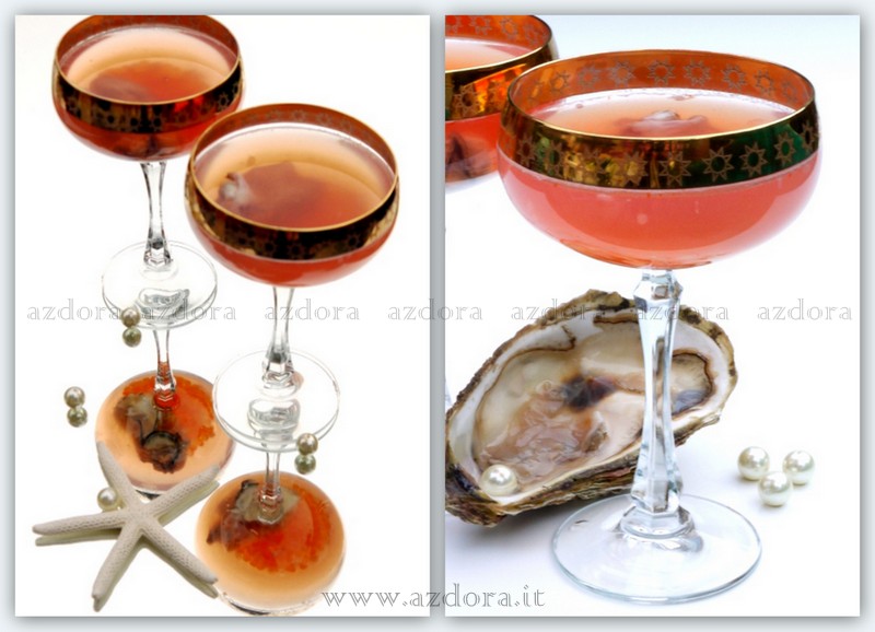 Отталкиваясь от классического сочетания устриц с шампанским, родился следующий рецепт – устрицы в желе из розового шампанского. Нужно замочить листовой желатин в холодной воде на 10 минут. Открывая устрицы, собрать вылившуюся из них воду в мисочку. Процедить эту воду и отмерить по одной столовой ложке на порцию, т.е. на бокал. Открыть бутылку розового шампанского. Шампанское может быть холодным или комнатной температуры (это не повлияет на финальный результа) и не обязательно выпускать из него газ. Довести до кипения воду от устриц. Разбухший желатин растворить в снятой с огня кипевшей воде и влить воду с желатинов в шампанское. На дно бокалов выложить по устрице и по чайной ложечке красной икры. Залить шампанским и убрать в холодильник, пока шампанское не застынет.
