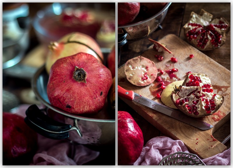 Надрезанный гранат опустить в воду в воде разломать его на дольки. Не доставая гранат из воды, отделить зернышки от кожуры и от пленок. Мы заметим следующую вещь: зернышки будут опускаться на дно миски, а шкурки и плёнки плавать на поверхности воды. Когда один гранат очищен, собрать шкурки и пленочки (я собираю их маленьким ситечком), зернышки откинуть на дуршлаг, а затем переложить в чистую посуду.