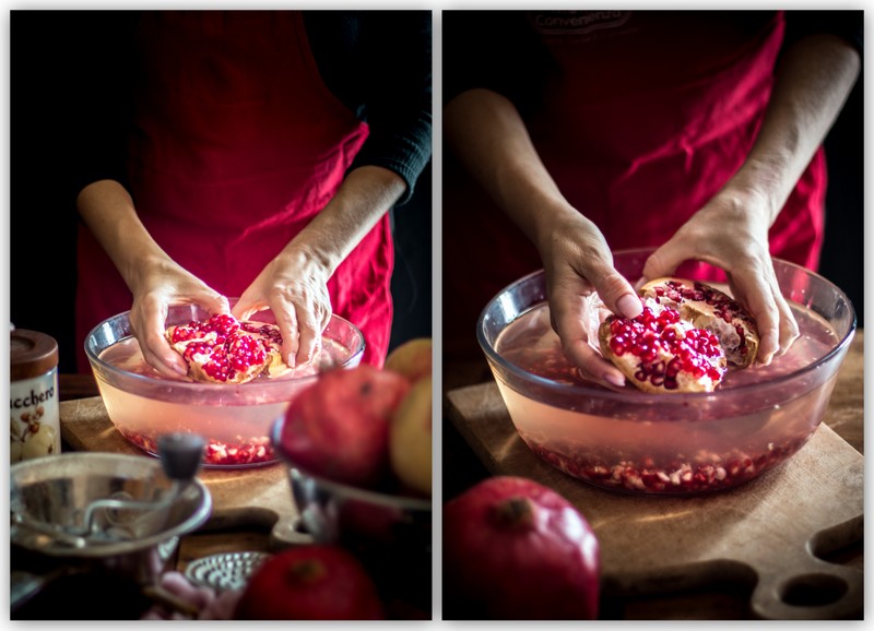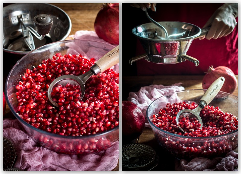 У меня количество гранатов всегда очень большое, около 5 кг, и раньше я для отжима сока использовала измельчитель passaverdure (электрический или ручной), который предназначен для перетирания вареных овощей, приготовления супов-пюре и используется итальянскими хозяйками для изготовления знаменитой итальянской пассаты из помидоров или, по-простому, томатного соуса. Чтобы уж совсем защититься от нежелательных брызг, я накрываю измельчитель во время работы бумажным полотенцем.