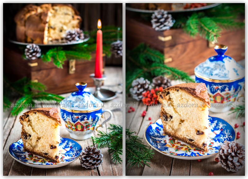 Наконец-то я дошла до главного праздничного блюда! Панеттоне –это, грубо говоря, сладкий белый хлеб, необыкновенно мягкий и воздушный, с цукатами, орешками и изюмом. Родина его – Милан. Когда-то панеттоне пекли дома под строжайшим надзором главы семьи, который, перед тем как ставить панеттоне в печь, должен был начертить на его верхушке крест, что считалось счастливой приметой на весь новый год. Готовый панеттоне был частью особого ритуала, который назывался «церемония полена». Глава семьи зажигал огонь в камине, осенял себя крестным знамением , бросал в камин дубовое полено, оплетённое можжевельником, наливал бокал вина, немного вина плескал в огонь, затем пил сам и передавал бокал по кругу всем родным. Затем бросал в огонь монетку, а остальные монеты раздавал присутствующим. Приносили три панеттоне и макушку первого панеттоне хозяин срезал и оставлял до февраля, до особого дня, в который эту макушку должны были освятить, чтобы её можно было хранить до следующего Рождества, на счастье. Чудесная легенда объясняет нам, как родился панеттоне и почему он так называется. Говорят, что во время рождественского пира при дворе Лудовико Сфорца двеннадцатилетний помощник повара Тони уснул и сжёг праздничный пирог. Он так сильно напугался, когда, проснувшись, увидел чёрный дым, валивший из печки, что смешал всё, что только попалось ему под руку: муку, яйца, масло,изюм, орешки. В итоге получился чудесный воздушный хлеб, который так понравился Лудовику Сфорца, что он велел печь его и впреть на каждое Рождество. Pane (пане) по-итальянски значит «хлеб». Pane di Toni стал со временем называть не иначе, как Panettone – панеттоне.