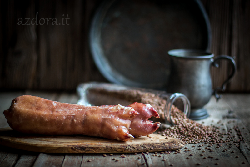 И первым не могу не упомянуть  одно очень важное блюдо –  Zampone- одно из главных блюд новогоднего стола. Это передняя свиная нога, выпотрошенная и фаршированная свиным мясом со щек, головы, горла и лопатки, перемешанным со шкурками и со специями. Дзампоне отваривают до полуготовности и в таком виде продают.Дома нужно всего лишь доварить его ещё часок.  История дзампоне, традиционного блюда моденской кухни, насчитывает четыре столетия. Она неразрывно связана с двумя всенародно известными историческими персонажами: папой Юлием II делла Ровере и Джованни Пико делла Мирандола. В 1511 году войска папы Юлия II осадили городок Мирандола. Жители города решили забить всех свиней, чтобы они не достались неприятелю. Но при переработке мяса у мясников не хватило кишок для изготовления традиционных свиных колбас, и тогда одному повару семьи Пико пришла в голову гениальная идея: начинить свиным фаршем шкуру передних ног. Осада Мирандолы завершилась 30 января 1511 года, когда войска Юлия II взяли город, а сам папа стал одним из первых дегустаторов «Дзампоне от Пико».
